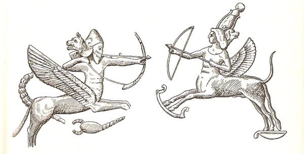 Per cogliere bene le affinità tra questo zodiaco e quelli babilonesi, ci si soffermi sul Sagittario e quanto di poco egizio esso abbia. In proposito riporto di seguito due immagini di Sagittario, a sinistra quella babilonese (con due teste) a destra quella egiziana presente a Dendera. Sembra evidente la discendenza della seconda dalla prima.