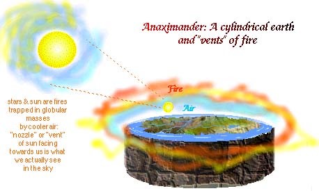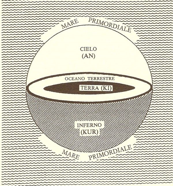 Nella figura seguente vi è spiegato quanto visto in modo più comprensibile, così come realizzato da S. Kramer (citato da Pichot) in base a testi decifrati su tavolette d’argilla. Si tratta di una cosmologia che accomuna l’intero mondo antico: al centro dell’universo, chiuso e limitato, vi è la terra che è circondata dal mare; sopra la terra vi è l’aria ed il cielo con gli astri e tutti i fenomeni metereologici; sotto la terra vi è l’inferno (non specificato in senso biblico e cristiano); l’intero universo è contenuto in un mare primordiale, quindi da acqua che in qualche modo è quella che dà vita al tutto. Occorre sottolineare che anche in Omero (XII secolo a.C.) l’origine di tutte le cose è l’Oceano (si tenga presente ciò perché, più oltre, lo ritroveremo in Talete).