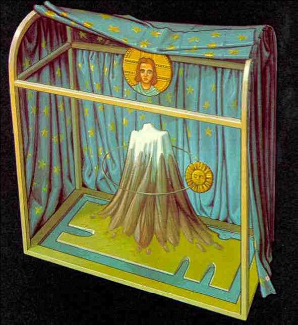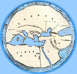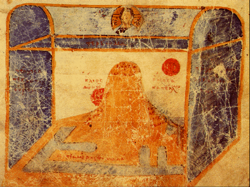 Il disegno che segue rappresenta in modo più fantasioso quanto rappresentato precedentemente. E’ un disegno che include la Dimora di Dio e fa vedere che la trerra è una piattaforma galleggiante sorretta da colonne lungo la circonferenza (Gerusalemme, la Cupola, al centro della terra, in posizione perpendicolare con la dimora di Dio). C’è comunque da dire che il popolo ebraico dedicò poco tempo a questioni astronomiche (il loro riferimento è comunque babilonese e non egizio). Per tale popolo il dio è onnipotente ed è inutile ricercare leggi naturali laddove la mutevole volontà del creatore può cambiarle a piacimento in ogni istante(4).