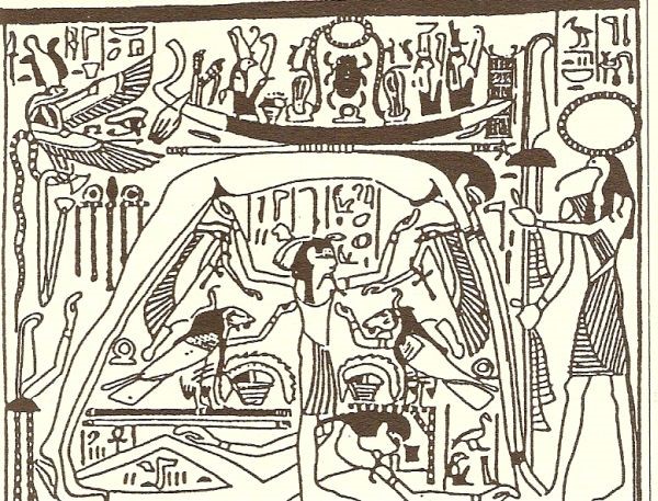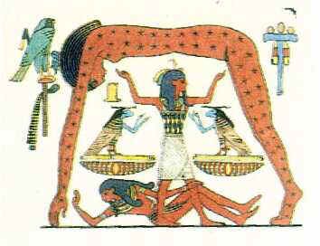 Il disegno che segue, riferito alla cosmologia egizia, sembra del tutto diverso ma rappresenta la stessa cosa. Si tratta di un dipinto che, in differenti varianti, troviamo in molti templi e tombe egiziane (la variante successiva è più chiara nel descrivere alcuni dettagli). La donna arcuata, la dea del Cielo Nut, rappresenta il cielo (nella figura immediatamente seguente vi sono anche disegnate le stelle). Nut, il cielo, è sostenuta dal dio dell’Aria, Shu. Sdraiato in basso vi è il dio della Terra, Geb. Il dio sulla destra è Thot che, tra l’altro, rappresenta la Luna (in talune rappresentazioni si vede una feroce scrofa che ad intervalli regolari di un mese divora il dio Luna che regolarmente risorge e torna a crescere). Sopra al cielo vi è il battello del Sole che, idealmente, viaggia nell’acqua del Nilo superiore. Il Nilo superiore, come sembra dirci il disegno, scorrerebbe lungo lo Zodiaco (via lattea ?) dove fluttuano gli astri mobili (Sole, Luna, pianeti).