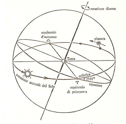 Sembra che l’Astronomia pratica dei primi tempi si limitasse alle osservazioni sulla levata e il tramonto eliaco [quando alle prime luci dell’alba si può ancora individuare una certa stella, si parla di sua levata eliaca, ndr] delle stelle principali, alle loro occultazioni per opera della luna e dei pianeti ed alle eclissi. Il percorso del sole era seguito per mezzo delle stelle offuscate dalla luce del crepuscolo e forse pure mediante le variazioni dell’ombra meridiana dello gnomone; si determinava il movimento dei pianeti osservando le stelle a cui s’avvicinavano nel loro corso. Per riconoscere tutti questi astri e i loro movimenti si divise il cielo in costellazioni e la zona celeste, detta Zodiaco, da cui il sole, la luna e i pianeti non si scostano mai, fu distinta nelle dodici costellazioni seguenti: Ariete, Toro, Gemelli, Cancro, Leone, Vergine, Bilancia, Scorpione, Sagittario, Capricorno, Acquario, Pesci. Furono chiamati segni, perché servivano a distinguere le stagioni; così l’entrata del sole nel segno dell’Ariete coincideva, ai tempi di Ipparco, con l’origine della primavera; quest’astro percorreva in seguito il Toro, i Gemelli, il Cancro, ecc.; ma il movimento retrogrado degli equinozi cambiò questa marcia delle stagioni e poiché gli osservatori, abituati a far coincidere l’inizio della primavera con l’entrata del sole nell’ Ariete, continuavano a designarla con tal mezzo, si finì col fare due cose distinte delle costellazioni e dei segni dello Zodiaco; i quali non furono più che un oggetto ideale, proprio a rappresentare i movimenti del Sole. Ora, che si cerca di giungere dovunque alle nozioni ed espressioni più semplici, si propende a tenere in non cale lo Zodiaco ed a segnare la posizione degli astri sull’eclittica mediante la loro distanza dall’equinozio.