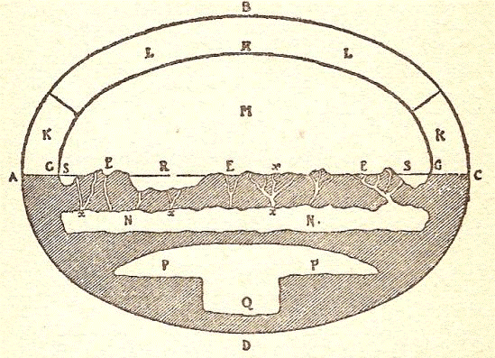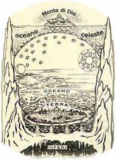 Il disegno seguente è la ricostruzione schematica fatta da G. Schiapparelli, del mondo biblico(3): ABC rappresenta il cielo superiore; ADC il contorno dell’abisso; AEC il piano della terra e dei mari; in GHG vi è il firmamento o cielo inferiore; in KK i depositi dei venti; in LL i depositi delle acque superiori (piogge), della neve e della grandine; M è lo spazio occupato dall’aria dove corrono le nubi; in NN abbiamo le acque del grande abisso che alimentano in xxx le fonti, i fiumi ed i mari (Dio… separò le acque, che sono sotto il firmamento, dalle acque che son sopra il firmamento – Genesi 1, 7); PP è la zona del limbo mentre Q, la sua parte inferiore è l’inferno vero e proprio.