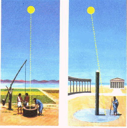 forniva la posizione del sole (una sorta di orologio solare). Il polos è qualcosa di molto più raffinato. Questo strumentoconsiste in una mezza sfera scavata nel suolo o in un blocco di pietra; un globo, portato da un’asta o sospeso ad una
