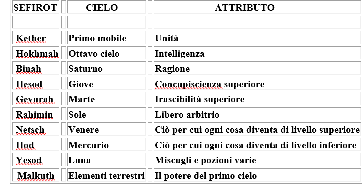 I dieci ‘sefirot’, i dieci più comuni nomi di Dio che nel loro insieme fanno Dio, sono alla base della cabala di Pico. Anche nella cabala gli angeli giuocano un ruolo importante ma qui si comincia a distinguere tra spiriti del bene, gli angeli, da quelli del male, demoni. Ad ogni spirito buono corrisponde un simmetrico malvagio. Mediante la cabala si può avviare una persona alla meditazione o aiutarla mediante l’invocazione con parole ebraiche speciali degli angeli adeguati al problema; tali nomi, con opportune abbreviazioni o con numeri che hanno precise corrispondenze con le lettere, possono essere incisi sui talismani di Ficino in lingua ebraica. Particolari formule che relazionavano numeri con lettere permettevano anche alla conoscenza di quanti erano gli spiriti abitanti dei cieli: 301.655.172. Il ricavare un numero come questo non era troppo importante dal punto di vista magico ma serviva per sapere quanti erano gli angeli al servizio di un dato ‘sefirot’ e come invocarli. È una curiosità l’elencare i nomi dei ‘sefirot’ a lato delle corrispondenze che hanno con le sfere celesti e degli attributi che Pico attribuisce ad ognuno: