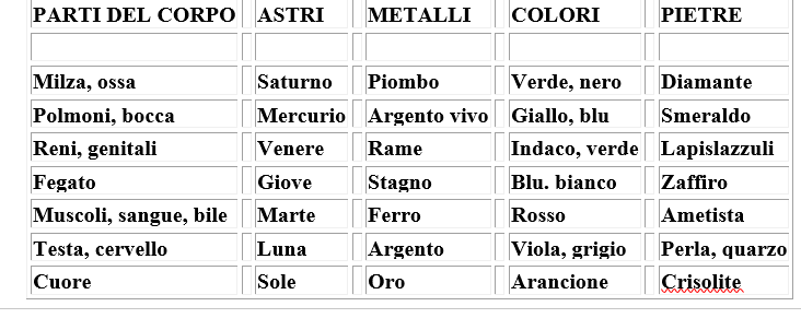 Una delle cose che si credono di conoscere, e che tutti conoscono, è la ricerca della pietra filosofale. Di cosa si tratta. Le interpretazioni divergono ma in qualche punto vanno a coincidere. Secondo Aristotele il cielo della Luna divide il mondo in due zone: quella sotto che è soggetta a generazione e corruzione ed in generale a cambiamento e caos; quella sopra che è eterna, immutabile e costituita di una essenza perfetta come l’etere (la quintessenza, che era chiamata così in quanto si aggiungeva ai quattro elementi: terra, acqua, aria, fuoco). La ricerca sotto il cielo della Luna di questa sostanza (l’etere) era compito principale dell’alchimista. Tale essenza, mescolata ad altre sostanze le avrebbe rese perfette e, ad esempio (ma questo è solo un aspetto marginale dell’alchimia e riguardava appunto ingordi e ciarlatani), avrebbe potuto tramutare il piombo ed altri metalli vili in oro o argento. Altra versione voleva tutti i metalli costituiti da un miscuglio di mercurio e zolfo (con caratteristiche non reali ma filosofali) e quando la proporzione tra i due era perfetta, il metallo risultante sarebbe stato l’oro. Più in generale, in questa ricerca l’alchimista studiava le varie sostanze e ne cercava le proprietà. Tentava miscugli, distillava (introducendo nel suo lavoro fornelli ed alambicchi che si riveleranno utilissimi per la ricerca chimica come la intendiamo oggi), catalogava, operava, in modo che oggi giudicheremmo rozzo, come un chimico ( si tenga conto che nel Cinquecento la scoperta di procedimenti chimici legati alla tecnica, ad esempio estrattiva, dette inizio alla separazione dell’alchimia che assunse caratteristiche se possibile più segrete, con quella che sempre più si affermerà come chimica). L’impossibilità di produrre qualcosa che potesse poi essere in qualche modo raccolta in un testo e fare da base per ulteriori studi nasceva da quel segreto cui accennavo e soprattutto dall’approccio che si aveva allo studio delle sostanze medesime. Quali erano le caratteristiche che determinavano le differenze tra le sostanze ? Quelle qualitative. Il colore, ad esempio rivestiva una importanza fondamentale: il nero era associato alla morte mentre il verde ad un buon raccolto nei campi, il ‘vitriol’ (abbreviazione del latino: visita interiora terrae rectificando invenies occultum lapidem che vuol dire “vai a cercare all’interno della terra e con corrette operazioni troverai la pietra nascosta”) indicava sostanze con caratteristiche di brillantezza e cristallinità. Poi vi era il sapore, … Ma ciò che legava strettamente alchimia ed astrologia era la corrispondenza tra sette metalli con i sette astri allora noti: Sole-Oro, Luna-Argento, Marte-Ferro, Venere-Rame o Bronzo, Mercurio-Argento vivo (mercurio), Saturno-Piombo, Giove-Stagno. E, come vedremo, analoghe corrispondenze si costruiranno in medicina tra astri, metalli e parti del corpo.