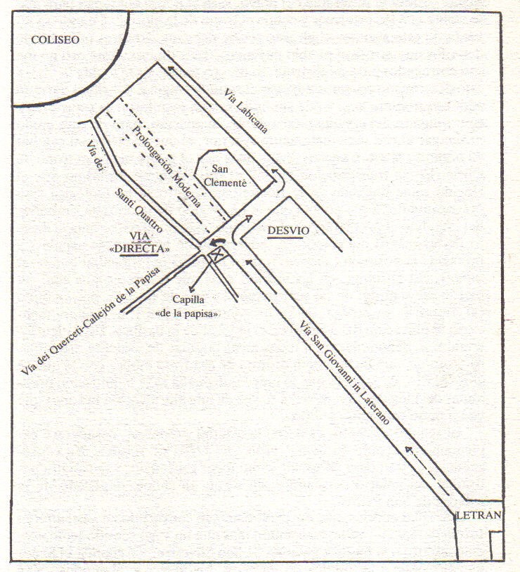 Una piantina dei luoghi interessati alla processione (in spagnolo) tratta da Boureau. Credo si capisca ma alcune parole le traduco: Letran è Laterano; callejon è vicolo; desvio è deviazione; capilla de la papisa è l’edicola votiva nota come Sacello. Aggiungo che la Via Directa (indicata con la freccia in grassetto) era quella che veniva percorsa fino al XII secolo. Solo successivamente si seguì la deviazione verso Via Labicana