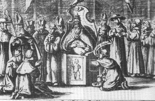 Naturalmente sulla vicenda, durante la Riforma, si speculò molto, anche con racconti che ridicolizzavano il Papato (insisto: non serviva proprio la Papessa per dare discredito a quella congrega di criminali). Tra i molti racconti, tutti spacciati per la vera storia della Papessa, che fiorirono uno in particolare merita attenzione ed è quello del luterano italiano Pier Paolo Vergerio che nel 1557 che, nel suo Historia di papa Giovanni VIII che fu meretrice e strega, dimostrò essere la Papessa una negromante, strega e prostituta. I cattolici, dapprima non reagirono ma poi si schierarono all’unisono (senza essere troppo convincenti) sulla storia della papessa come leggenda utile al discredito. In tal senso lavorò Onofrio Panvinio che nel 1563 riprese in mano le Vitae del Platina, ne fece una nuova edizione opportunamente annotata nel senso della leggenda a discredito. Sia il racconto di Vergerio che la parte della riedizione delle Vitae di Panvinio si possono leggere in Rendina [7].