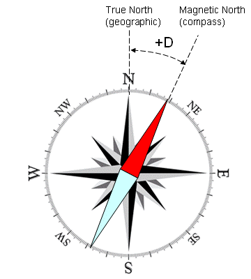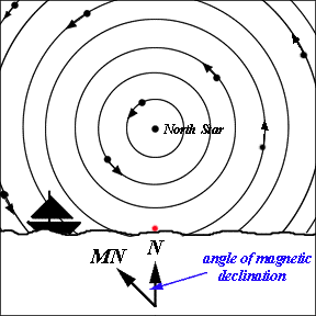 Il disegno mostra come nella pratica si determini la declinazione magnetica. Il nord geografico N è la retta che unisce l’osservatore ad una stella che determina il nord mentre la direzione dell’ago della bussola determina il nord magnetico MN.