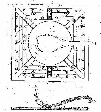 Una delle proprietà che venne scoperta (?) era quella per cui i magneti di forma allungata, barrette o aghi magnetici, se sistemati in condizioni di orientarsi liberamente su di un piano orizzontale si disponevano spontaneamente dirigendo sempre una delle due estremità (per questo chiamata nord dell’ago) verso il nord geografico mentre l’altra risultava diretta verso il sud geografico (sud dell’ago). Tale proprietà risulta sia stata sfruttata in Cina intorno al IV secolo d. C. con la realizzazione di bussole (dal greco πυξις che in latino diventa buxis e che, nelle due lingue, vuol dire “scatola di legno di bosso“) per orientarsi nella navigazione (fatto che permetteva il superamento del bordeggiare per inoltrarsi in mare aperto anche in condizioni di non visibilità del cielo ma SOLO con mare calmo). Esse erano in genere costituite da un recipiente contenente acqua, sulla quale galleggiava un piccolo oggettino di legno (una canna cava), spesso forgiato artisticamente con la forma di un drago, di un pesce, …, vincolato a ruotare liberamente intorno all’asse verticale centrale del recipiente. All’interno di tale oggetto era disposto un ago magnetico che, orientandosi come accennato, orientava anche l’oggetto, che quindi si disponeva indicando la direzione del nord.