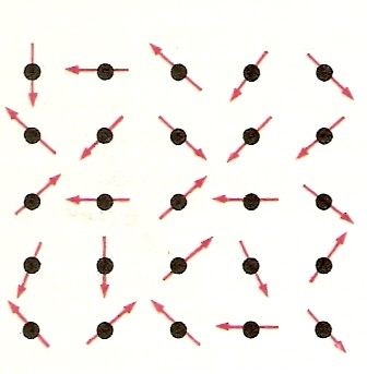 Ogni atomo, come fin qui visto, ha componenti magnetiche che discendono dagli elettroni che orbitano intorno al nucleo. Se pensiamo questa situazione all’interno di un gas è facile capire che i campi magnetici di ciascun atomo sono orientati in genere con il massimo disordine in modo da non dare alcun effetto all’esterno del gas medesimo. Se introduciamo lo spin l’atomo risulta avere componenti magnetiche doppie, quelle atomiche e quelle elettroniche e noi ora ci occupiamo solo di quelle elettroniche. Un gas, sotto questo profilo, è composto da tanti magnetini sistemati in modo del tutto disordinato, a temperature ordinarie. Invece di pensarlo così possiamo pensare che ogni magnetino sia rappresentato da un vettore che abbia i due poli magnetici alle due estremità (il Nord dal lato della freccia) di modo che il gas è come costituito da tanti piccoli vettori orientati a caso nello spazio (vedi la figura seguente).