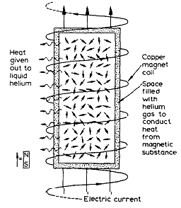 Alla temperatura di 1°K non debbono più esservi vibrazioni atomiche ed è quindi possibile intervenire sull’orientamento degli spin. Vediamo il modo di procedere per raggiungere il risultato (seguo il lavoro di Giaugue tratto dalla sua Nobel Lecture del 1949). Il sale paramagnetico, che è alla temperatura di 1°K dell’elio liquido che lo raffredda, viene messo all’interno di un intenso campo magnetico ottenuto con un avvolgimento di spire (il tutto deve essere perfettamente isolato dall’ambiente esterno).