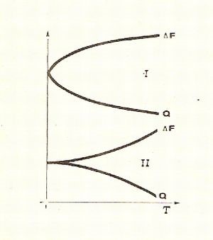 quando Q, e quindi anche ΔF, si suppone una funzione continua di T fino allo zero assoluto; ma ciò che voglio sottolineare è che ΔF e Q non sono solo uguali fra loro allo zero assoluto, ma i loro valori coincidono completamente anche nelle immediate vicinanze di questo punto. Graficamente, le curve per Q e F non solo terminano nello stesso punto allo zero assoluto (curve I in fig.), ma sono anche tangenti fra loro (curve II).