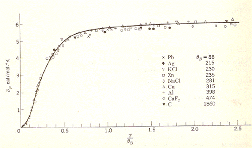 La curva teorica (a tratto continuo) si Debye a confronto con i dati sperimentali.