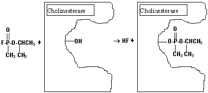 I gas nervini (GA,GB,GD e VX) sono tutti potenti inibitori dell’enzima colinesterasi, che idrolizza il neurotrasmettitore acetilcolina. Quando la colinesterasi è inibita, l’acetilcolina ostruisce le giunzioni tra i neuroni, prevenendo la trasmissione di segnali. I sintomi di avvelenamento sono: