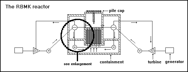Il corpo di tali reattori RBMK è costituito da circa 2500 blocchi di grafite (oltre 1500 tonnellate), che ha il ruolo di moderatore, all’interno dei quali sono ricavate le aperture nelle quali sono inseriti i canali del combustibile. Tali canali, in numero di circa 1700, sono costituiti da tubi, all’interno dei quali sono disposti, in due fasci di barre sovrapposti, gli elementi di combustibile che vengono direttamente lambiti dall’acqua refrigerante.