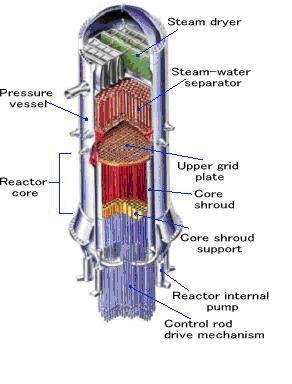 Un contenitore di acciaio legato rivestito di acciaio inox (eccetto il coperchio, che viene a contatto col vapore saturo secco) dello spessore di circa 16 cm contiene il nocciolo del combustibile nucleare (il cosiddetto ‘core’), dove avviene la reazione nucleare di fissione, attraverso la quale gli atomi di uranio vengono scissi in atomi più leggeri con conseguente liberazione di grandi quantità di energia termica. Questa viene ceduta ad un flusso di acqua che scorre dal basso ad opera di pompe, che conseguentemente si scalda, mantenendo il combustibile nucleare a temperatura costante. L’acqua funge in tale sistema quindi sia da refrigerante che da moderatore dei neutroni prodotti dalla reazione di fissione (ovvero questi ultimi, generati ad alta energia, perdono velocità per successivi scontri con gli atomi di idrogeno dell’acqua fino a raggiungere un livello cosiddetto ‘termico’, al quale aumenta la loro probabilità di innescare ulteriori fissioni e consentire quindi il mantenimento della reazione nucleare a catena – si parla in questo caso di ‘reattore critico’).