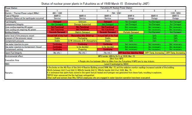 Si può rilevare che nelle unità 1 e 3 l’integrità del combustibile nucleare è stata danneggiata, che il livello di refrigerante (stando alle stime) si attesta attorno alla metà delle barre combustibili, che i sistemi di refrigerazione non sono funzionali, che l’edificio di contenimento del reattore non sembra compromesso, al contrario dell’edificio, che si sta continuando a iniettare acqua di mare sia nel nocciolo che nel recipiente in pressione e che continua la ventilazione. Bisognerà attendere ulteriori sviluppi nei prossimi giorni.