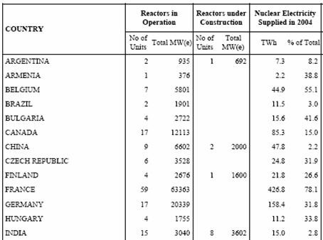 Reattori nucleari in funzione nel mondo, agosto 2005