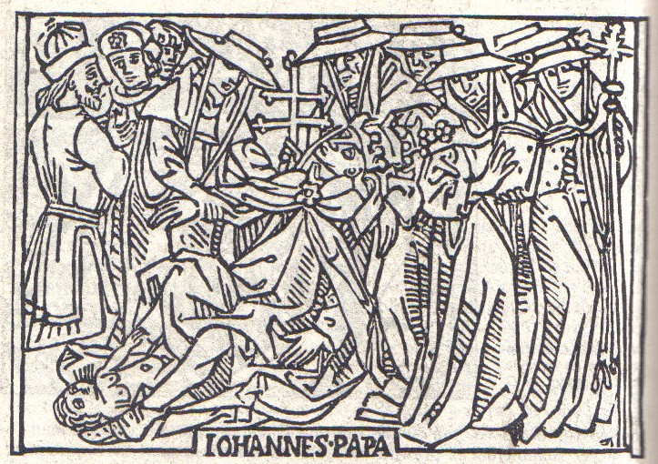 L’origine più probabile della leggenda della “Papessa Giovanna”, una donna, travestita da uomo, che sarebbe ascesa al seggio papale, salvo poi essere scoperta a causa di una gravidanza inopportuna: più semplicemente la leggenda era una metafora di una donna, Marozia (della quale parlerò diffusamente più oltre), che aveva talmente condizionato con sesso ed intrighi più di un Papa da essere lei stessa considerata Papa. La leggenda, ampiamente diffusa a partire del XIII secolo, vuole che per due anni, all’incirca dall’853 all’855 (fin quando non fu scoperta per la nascita di un figlio durante una processione), venne eletta la Papessa, travestita da uomo, con il nome di Papa Giovanni VIII.