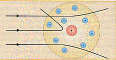 La pasticca del radio emette, fra l’altro, radiazioni a, cioè particelle formate tra l’altro da due protoni (nuclei di elio: He2+). Queste particelle escono a gran velocità dalla fenditura F e vanno ad urtare ed attraversare la lamina d’oro. A quell’epoca si aveva a disposizione il modello atomico di Thomson ed un pezzo di materia, costituito da questi atomi era pensato molto compatto (vedi la figura (a)):