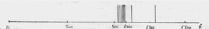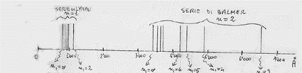 La relazione (10), trovata da Bohr, spiegava bene le righe spettrali osservate la prima volta nel 1906 e relative ad n = 1. appunto in quell’anno Lyman osservò, con uno spettroscopio per radiazione ultravioletta (UV), uno spettro di radiazione, emesso dall’idrogeno, costituito da tante righe che andavano addensandosi intorno alla lunghezza d’onda di 908 Å (che corrisponde ad n1 = ∞), come mostrato in figura: