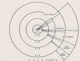 Quindi tutte le altre situati in altre regioni dello spettro. In definitiva, per quel che riguara il visibile si ritrova la formula che empiricamente aveva dato Balmer. E merito di Bohr fu proprio l’aver dato un significato a quella costante B che avevamo incontrato in quella formula. Inoltre la formula di Bohr era in grado di prevedere altri spettri a frequenze diverse e tutto questo fu confermato sperimentalmente (con una qualche deviazione al crescere di Z, come vedremo). Nelle figure che seguono sono riportate tutte le serie spettrali dell’idrogeno: