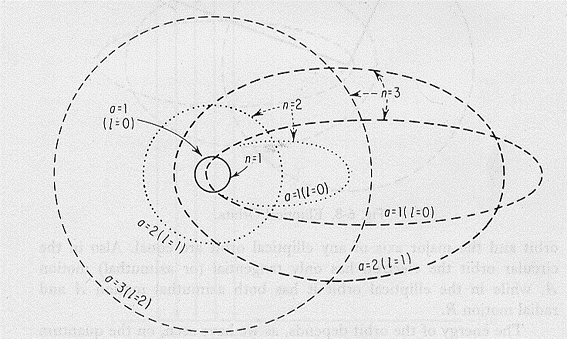 I due postulati di Bohr forniscono un nuovo modello di atomo che è simile a quello di Rutherford con la fondamentale differenza che ora non tutte le orbite sono permesse all’elettrone (quantizzazione dell’energia o dei livelli energetici). In tal modo l’edificio atomico risulta stabile anche se con qualche difficoltà teorica. Non sto qui a fare una storia dettagliata della mese di lavori che venne dopo quelli di Bohr. Ma occorre dire che questo modello atomico fu perfezionato da Sommerfeld nel 1916. Sommerfeld, per tentare di eliminare la non adesione ai dati sperimentali del modello per Z > 1 (ed anche alcune questioni legate all’intensità delle linee spettrali), applicò all’intero atomo una quantizzazione più spinta. Infatti la quantizzazione del momento angolare introdotta da Bohr limita i gradi di libertà di un elettrone costringendolo ad un raggio R di una determinata orbita. Sommerfeld suppose che l’elettrone, muovendosi nello spazio ha tre gradi di libertà e non uno solo. Sviluppando matematicamente il concetto Sommerfeld introdusse tre numeri quantici (vedi più avanti), anziché il solo numero quantico n, come aveva fatto Bohr. Il primo numero quantico, n (quanto principale, che può assumere valori interi e positivi), come quello di Bohr, indica l’orbita su cui l’elettrone si muove (il suo livello energetico). Il secondo numero quantico, l (quanto azimutale, che può assumere valori interi e positivi), ci dà invece lo schiacciamento delle orbite (queste non sono più circolari, come aveva indicato Bohr, ma possono anche essere ellittiche: più l è grande, più l’orbita è schiacciata o eccentrica).