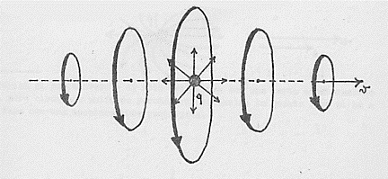 Quando questa carica si muove non si avrà più la situazione vista precedentemente (aumento di campo a destra uguale alla diminuzione di campo a sinistra); ora il campo a destra crescerà di più di quanto diminuisca il campo a sinistra proprio a causa della accelerazione della carica e della conseguente dissimetria destra-sinistra del campo stesso. A questo aumento di campo corrisponde, come già sappiamo, un aumento di energia ed il bilancio destra-sinistra della carica in moto è tale per cui c’è un eccesso di energia risultante nella direzione del moto. Questo eccesso di energia originato a spese della carica che crea il campo si trasferirà in tutto lo spazio circostante sotto forma di radiazione elettromagnetica.
