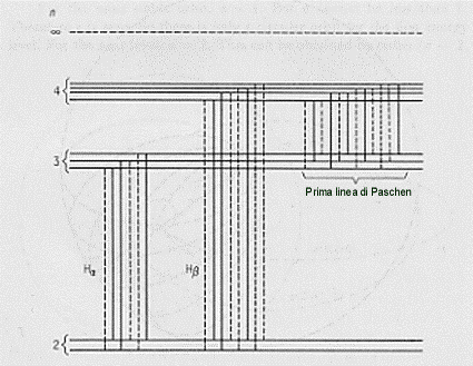 Un’altra importante novità nella trattazione di Sommerfeld dell’atomo di Bohr è l’introduzione della teoria einsteniana della relatività (1905) per lo studio del movimento degli elettroni orbitanti intorno al nucleo. Gli elettroni planetari, infatti, si muovono a velocità molto vicine a quella della luce (velocità della luce ed a questa velocità è importantissimo introdurre la teoria della relatività che ci rende conto di altri fatti sperimentali altrimenti non spiegabili (la separazione dei livelli energetici, andando a studiare la struttura fine degli spettri degli atomi che consiste in un maggior numero di righe osservate se l’osservazione è fatta in modo più sofisticato, con uno strumento cioè in grado di separare linee che grossolanamente sembrano una sola. Nella figura seguente si può vedere come, in struttura fine si separano le prime due righe della serie di Balmer e la prima di quella di Paschen).