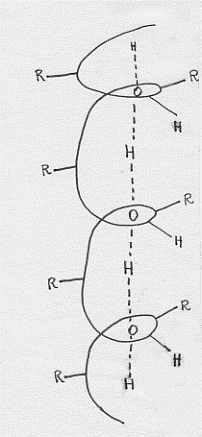 Disegno schematico di una catena peptidica, alla base di proteine ed amminoacidi. Nella prima figura i pallini neri sono legami idrogeno. Nella seconda, vi è la schematizzazione della prima per far notare che il legame idrogeno (linea tratteggiata) attraversa tutto l’asse della macromolecola. Osservo che il simbolo R sta ad indicare l’inizio di una catena laterale di altri componenti (residui amminoacidi)