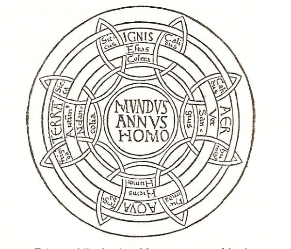 La figura è tratta dall’opera di Isidoro di Siviglia De responsione mundi et astrorum ordinatione, stampata ad Augusta nel 1472. Epitome della dottrina del macrocosmo e del microcosmo. Tale dottrina fu accettata e compresa per tutto il periodo intercorso tra poco prima dell’era cristiana e il XVII secolo. Una serie di cerchi concentrici rappresenta le sfere concentriche della astronomia antica, con il Mondo, l’Anno e l’Uomo al centro. Un altro cerchio porta il nome dei quattro elementi, associati alle quattro stagioni e ai quattro umori. Ai lati di ciascun elemento sono i nomi delle «qualità». Il cerchio più esterno raffigura il limite che divide il nostro mondo da quello celeste di cui non possediamo una conoscenza diretta. Si notino assonanze con la cabala ebraica (Isidoro era appunto di Siviglia, cuore di El Andalus dove per secoli hanno vissuto arabi ed ebrei) e con figure misterico-magiche che da allora ebbero grande diffusione.