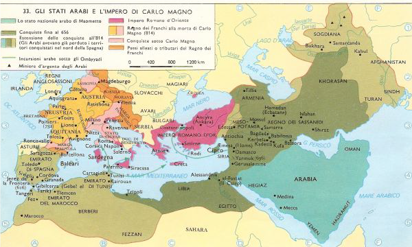 In ogni caso, a partire dal VII secolo, saranno i dotti bizantini a trasferire le loro conoscenze ed i loro codici agli umanisti dell’Occidente cristiano. Assai prima però la cultura greca era già stata trasmessa ad un altro popolo, quello arabo che era passato da un periodo iniziale puramente guerresco ad un crescente interesse per studi filosofico-scientifici (VIII secolo). Ed a questo punto la storia mette al centro dell’attenzione questa nuova forza costituita da popoli arabi che si riconoscono in una nuova religione monoteista, l’Islam, che preme da Sud sul Mediterraneo, sui resti dell’Impero romano e sull’Europa in genere.