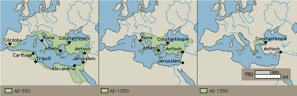 L’Impero romano d’Oriente visse per un migliaio di anni in un clima di cambio continuo di frontiere, di un instabile equilibrio politico e sociale, di frequenti lotte per motivi religiosi che si ripercuotevano continuamente nella vita pubblica. C’era Bisanzio, con l’eredità della Grecia e delle colonie dell’Asia Minore, come nucleo stabile ma l’Impero si gonfiava e si sgonfiava a seconda degli attacchi esterni e delle invasioni e delle capacità dell’imperatore di turno. Il potere era e non poteva essere che molto centralizzato per tenere insieme una miriade di popoli, costumi, religioni differenti. Il peso delle tasse e degli obblighi militari era tutto dei contadini che avevano una situazione non dissimile ai servi della gleba dell’Europa feudale. Dall’esterno vi erano pressioni continue dal Nord e dall’Est (visigoti, unni, ostrogoti, bulgari) che combattevano per conquistare le pianure del Danubio ed i Balcani. Altre pressioni venivano dalle repubbliche marinare Venezia e Genova. Vi furono poi gli attacchi religioso-commerciali delle Crociate, la quarta delle quali arrivò ad attaccare e saccheggiare la medesima Costantinopoli (1204) facendola diventare colonia di veneziani e franchi ed avendo come effetto collaterale il
