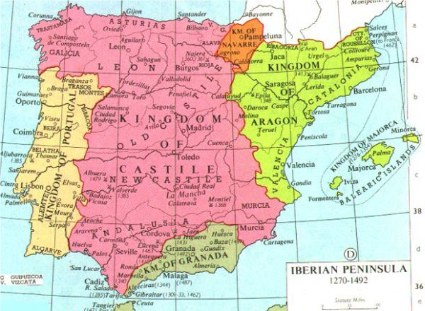 In soli tre anni, tra il 711 ed il 714, gli arabi musulmani del califfato Omeya di Damasco occupano la penisola iberica provenendo da Sud. I cristiani vengono respinti verso nord e lì si attesteranno in piccoli regni situati in posti strategici sulle montagne della cordigliera Cantabrica e dei Pirenei. Nel 756 gli Omayyaddi di Spagna si rendono indipendenti da Damasco e costituiscono il Califfato di Cordova. Questo Califfato si manterrà fino al 1031 per poi smembrarsi in tanti piccoli regni (taifas). A questa data la penisola contava al Nord i regni cristiani di León, Navarra, Aragón, Cataluña (circa un terzo del territorio) una striscia di terra di nessuno divideva questi piccoli regni dai taifas arabi costituenti la regione di ‘Al Andalus’. La debolezza militare araba permette l’avvio, nel 1045, della Riconquista che si concluderà nel 1492. Da sottolineare la conquista cristiana di Toledo del 1085, il formarsi al Nord di tre stati cristiani sempre più grandi ed aggressivi (Portogallo, Castiglia, Aragona e il piccolo Navarra). Dalla metà del XIII secolo il regno di Granada è tutto ciò che resta di arabo nella penisola. Nel 1469 Isabella I di Castiglia sposa Fernando II di Aragona dando inizio alla prima convergenza di regni ispani che in poco tempo occuperà tutta la penisola ed inizierà una impetuosa espansione in altri territori. Nel 1492 cade il regno di Granada, compiendosi il disegno di Fernando e Isabella: unificare i popoli di Spagna in nome della cristianità contro gli invasori arabi. La Crociata è portata a termine vittoriosamente e Papa Alessandro VI Borgia concede ai Re di Spagna il titolo di ‘Re Cattolici‘ (1494).