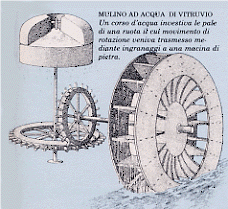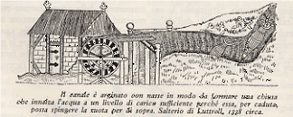 Una delle prime ruote alimentate dal flusso dell’acqua dal basso. Vennero poi introdotte le ruote ad acqua alimentate dall’alto (figura in basso).