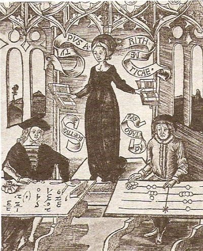 Una illustrazione allegorica della disputa tra abachisti ed algoritmisti. Lo striscione sul retro parla di Tipi di aritmetica ed i contendenti sono l’abachista Pitagora (rappresentato in difficoltà) e l’algoritmista Boezio. La fanciulla detta i problemi e fa da giudice.