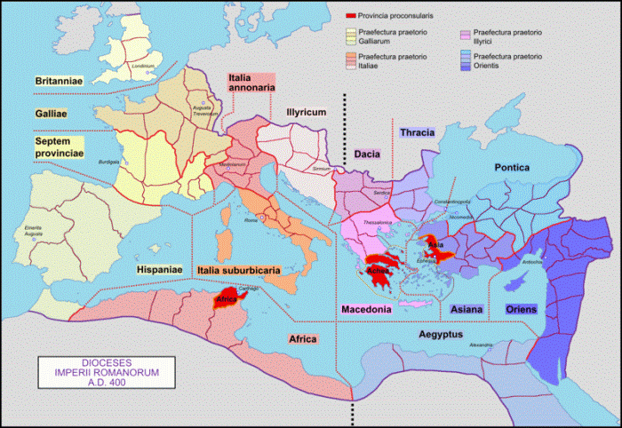 La linea punteggiata suddivide l’Impero Romano in Oriente ed Occidente