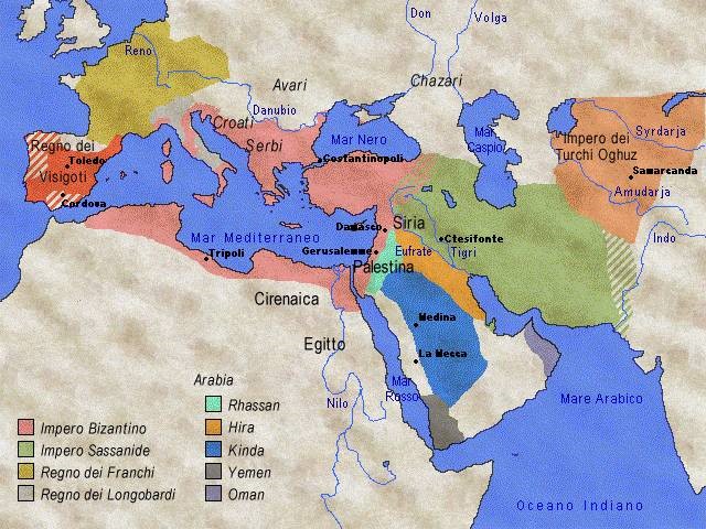 Per capire meglio cosa accade in una zona dell’Asia, l’Arabia, sul finire del VI secolo è utile avere presente una carta geografica che metta insieme quel territorio, con la suddivisioni nei diversi regni, con il bacino del Mediterraneo: