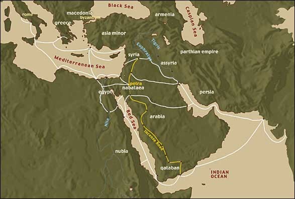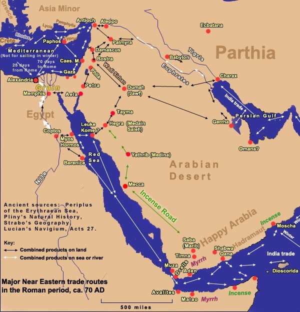 Dopo questa mappa ne riporto altre due con le rotte commerciali dall’Oriente all’Arabia e quindi al bacino del Mediterraneo.