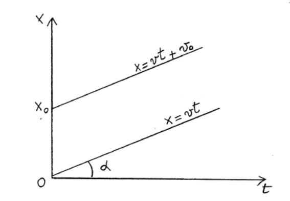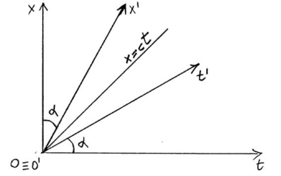 Riferendoci ora alla figura 77 (quando ancora non avevamo posto c = 1 secondo-luce al secondo) la pendenza di una retta era data da v = tg α; con la posizione fatta a proposito dell’unità di misura di c, e quindi di x, si ha che (c numericamente vale 1):