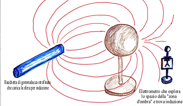 Evidentemente le linee di forza originate dalla bacchetta sono, anche qui, curve e tali da andare dietro la sfera indotta.