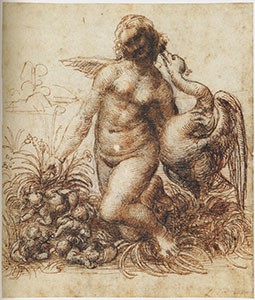 Leda ed il cigno (Chatsworth, Duke of Devonshire’s Collection). E’ un disegno perché l’opera o non è stata realizzata o è andata perduta. Ispirandosi al lavoro di Leonardo furono realizzate molte copie.