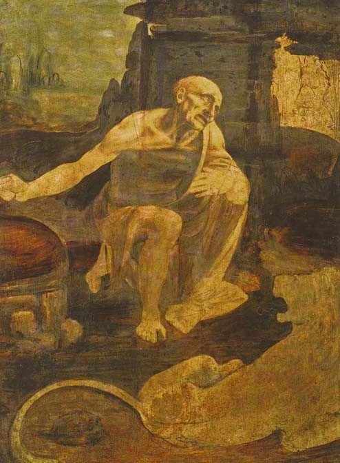 Lionardo da Vinci fu nel tempo di Michele Agnolo: et di Plinio cavò quello stucco con il quale coloriva, ma non l’intese bene: et la prima volta lo provò in uno quadro nella Sala del Papa che in tal luogo lavorava, et davanti a esso, che l’haveva appoggiato al muro, accese un gran fuoco, dove per il gran calore di detti carboni rasciughò et secchò detta materia: et di poi la volse mettere in opera nella Sala, dove giù basso il fuoco agiunse et seccholla: ma lassù alto, per la distantia grande non vi aggiunse il calore et colò.