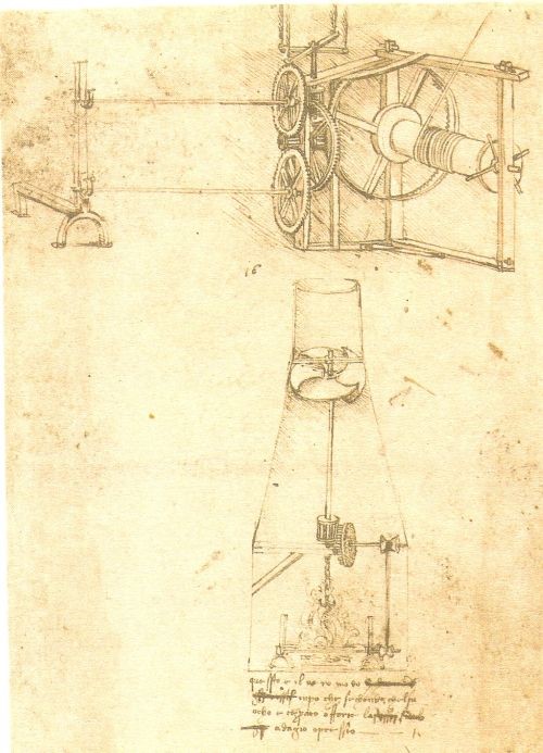 (13) Le fonti di energia che Leonardo utilizza o pensa di utilizzare in suoi diversi scritti sono: quella animale, quella muscolare umana, quella dell’acqua, quella potenziale di pesi opportunamente disposti, qualche volta quella del vento, quella immagazzinata da molle, quella dell’aria calda (nel suo studio di un girarrosto automatico è l’aria calda che viene prodotta dal fuoco e che sale lungo il camino a fare ruotare la ventola che è qui disposta; a sua volta la ventola ruotando trasmette il moto al girarrosto che si trova sul fuoco).