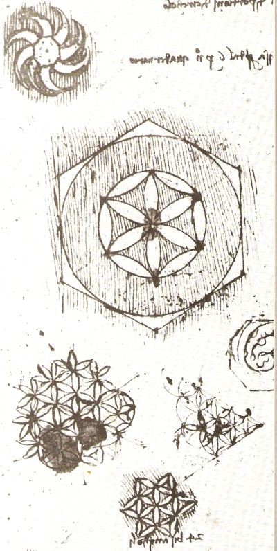 Una pagina di Leonardo con un’infinità di disegni con lunule (Codice Atlantico). Il procedimento di Leonardo è quello di considerare un quadrato inscritto in un cerchio e di riunire, due a due, congiungendone i lati diritti, i segmenti circolari o porzioni che restano fuori del quadrato. In tal modo si ottengono due figure simili a delle foglie che egli chiama bisangoli. Avendo a disposizione dei bisangoli, si possono sistemare dentro un cerchio in modo da dividerne la superficie in una parte, compresa tra la circonferenza ed il contorno dei bisangoli, che non è più un quadrato ma sempre equivalente ad esso e dall’altra parte le due foglie che sono equivalenti alle quattro porzioni. Se invece del quadrato abbiamo un esagono da inscrivere in un cerchio, allora risulteranno tre bisangoli. Con un gioco di questo tipo Leonardo trovò fino a 580 sottomultipli aventi la medesima forma che giocando con l’iscrizione in circonferenze dei sottomultipli con la medesima forma origina un traforato di pieni e vuoti dove il pieno equivale sempre alle sei porzioni ed il vuoto all’intero esagono inscritto. E’ d’interesse la conclusione che Leonardo ricava: questa infinita varietà di forme di una superficie quantitativamente immutabile ripete ciò che fa la Natura quando, con una limitata e immutabile quantità di materia, variando proporzioni e proporzionalità, ottiene la grande varietà di ciò che ci offre (Marinoni). Un esempio del modo di operare di Leonardo è nella figura seguente.