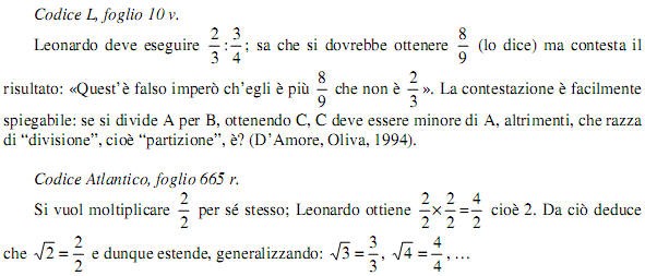 Occorre iniziare a dire che Leonardo, prima della conoscenza di Pacioli litigava anche con l’aritmetica elementare. E’ d’interesse riportare alcuni esempi, come fatto da Bagni e D’Amore dell’Università di Bologna: