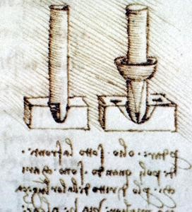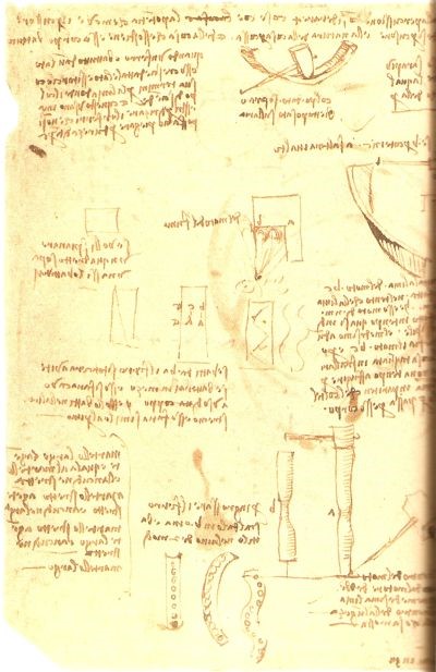 Leonardo proseguì anche gli studi di Giordano Nemorario sulle componenti delle forze, approfondendo il concetto della componente di un peso nel senso della traiettoria considerando anche la componente normale alla traiettoria stessa. Si deve a lui la decomposizione, nel piano inclinato, del peso secondo le sue componenti (parallela al piano e perpendicolare ad esso) e la scoperta del teorema, importante per la risoluzione numerica della composizione o scomposizione delle forze, che oggi possiamo enunciare così: il momento della risultante di due forze concorrenti rispetto ad un punto preso su una delle componenti, è uguale al momento dell’altra componente rispetto allo stesso punto. Questa scoperta è evidentemente legata proprio ai suoi lavori su macchine poiché, risulta evidente, che una tale proprietà non è empiricamente osservabile. Ed il momento fu oggetto di grande studio da parte del nostro applicando tale concetto in modo corretto e completo allo studio di corpi pesanti in rotazione intorno ad assi orizzontali. Egli lavorò anche sui centri di gravità degli oggetti, con le carrucole, con le resistenze di travi e colonne, sia per trazione che per torsione che per appoggio. Fu il primo a studiare meticolosamente con differenti esperienze sia l’attrito radente che quello volvente, occupandosi del problema per aver ben compreso la necessità della lubrificazione degli ingranaggi. Tutto ciò, va detto chiaramente, con un disordine eccezionale nei suoi scritti che, nelle intenzioni, dovevano servire da appunti per qualche pubblicazione e solo in tal senso vanno presi. Sono scritti non per un lettore ma come promemoria personali che, a volte, solo lui era in grado di capire. Spesso ai suoi appunti sono alternati brani copiati da qualche autore che magari avrebbe voluto in seguito citare o avrebbe voluto ampliare. A questo disordine contribuì certamente la dispersione delle migliaia di pagine dei suoi scritti, riordinati a piacimento di chi li ebbe in mano (vedi in proposito quanto detto alla fine della Parte I). Questa oscurità, che discende dalla difficoltà di lettura dei suoi scritti (che molti non hanno fatto, servendosi al più di antologie, me compreso), è alla base della fama di genio che accompagna Leonardo. Come sempre accade questa fama è tra persone non avvezze a studiare ed a capire, affascinate dai misteri, dalla metafisica e dall’ignoto, strada attraverso cui nascono tante leggende sulle quali è possibile manipolare coscienze e mediante le quali scrittori da poco si arricchiscono.