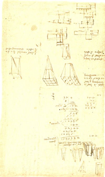 Ho più volte detto che Leonardo non conosceva la matematica. Egli conosceva i rudimenti di aritmetica e geometria che aveva avuto da ragazzo nella scuola d’abbaco. Aveva poi avuto da Luca Pacioli vari insegnamenti ed un suo libro la Summa de arithmetica, geometria, proportione et proportionalità cui seguì l’altro al quale Leonardo, come già detto nella Parte I, collaborò con i disegni prospettici di diversi tipi di solidi, la De divina proportione. Ciò che posso ora dire è che certamente Leonardo aveva maggiore simpatia per la geometria che per l’aritmetica mentre non conosceva l’algebra(7). L’aritmetica, nelle scuole d’abbaco, consisteva nell’apprendere le quattro operazioni e qualche radice quadrata. Vi erano poi nozioni di matematica commerciale perché queste scuole erano state costruite proprio per aspiranti tecnici che si dovevano dedicare ad attività commerciali, mercantili ed artistiche. Erano una sorta di avviamento professionale dell’epoca (per giovani dai 10-11 ai 16-17 anni), non rispondevano a programmi precisi, spesso non avevano un qualche scritto come testo. Infine, contrariamente alle scuole di grammatica dove le lezioni erano tenute in latino, in queste scuole l’insegnamento era in volgare e questo è il motivo per cui Leonardo non conosceva il latino.