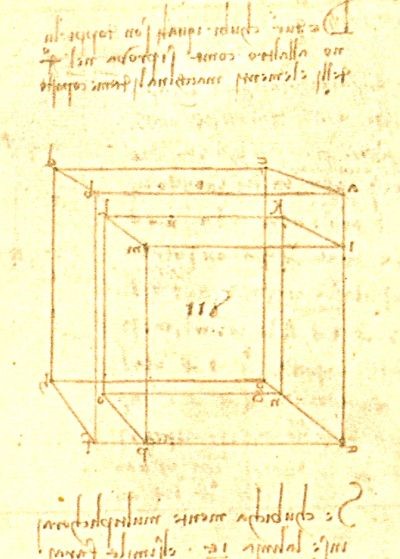 Anche se, pur dopo aver conosciuto Pacioli, continuò con qualche errore, egli mostrò di aver affinato molto le sue abilità mostrando che più conosceva la matematica più si appassionava ad essa (come accade ancora oggi). L’uso che egli ne faceva era comunque rapportabile a questioni rappresentabili geometricamente con riga e compasso anche se, oggi sappiamo, che non tutti i problemi si possono risolvere così. Ma in epoca in cui la massima conoscenza della matematica era molto carente, è impossibile imputare a Leonardo l’uso pratico che egli faceva di questa disciplina. Un esempio, ancora da Bagni e D’Amore, è quello del problema di Delo (o della duplicazione del cubo)(8) che Leonardo tratta nel Codice Atlantico. “Si considerano un cubo di lato 4 (dunque di volume 64) ed un altro di lato 5 (dunque di volume 125) affermando che il secondo è il doppio del primo. Ora, effettivamente, poiché la radice di 128 (doppio di 64) è approssimativamente 5,039, la differenza tra questo lato (voluto) e quello proposto 5, è davvero minima; dal punto di vista matematico, la proposta di soluzione di Leonardo è inaccettabile, mentre, dal punto di vista empirico, effettivamente la proposta è ragionevole“. Mi pare che, a tutti gli effetti, Leonardo, con i poveri strumenti che aveva, abbia duplicato il cubo.