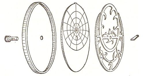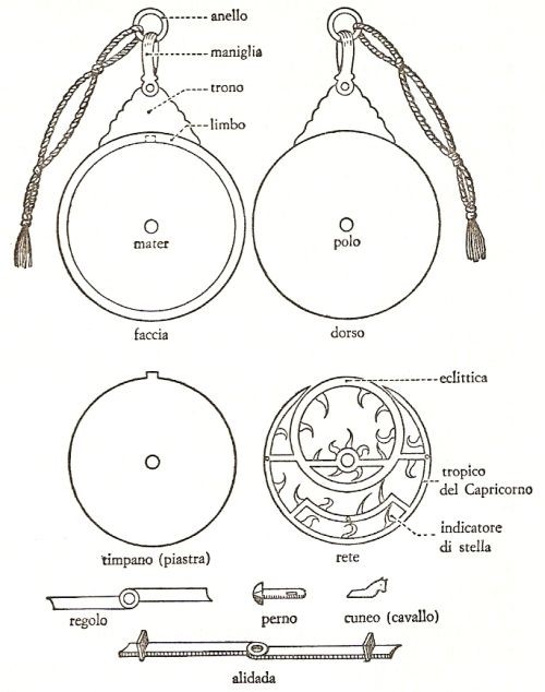 Costituenti base di un astrolabio (da sinistra a destra): perno; mater con una tacca in alto; timpano con incise linee altitudinali ed azimutali corrispondenti ad una latitudine data e munito di una sporgenza da incastrare nella tacca della mater; raggera o mappa delle stelle; cuneo da incastrare con il perno. [da Singer]